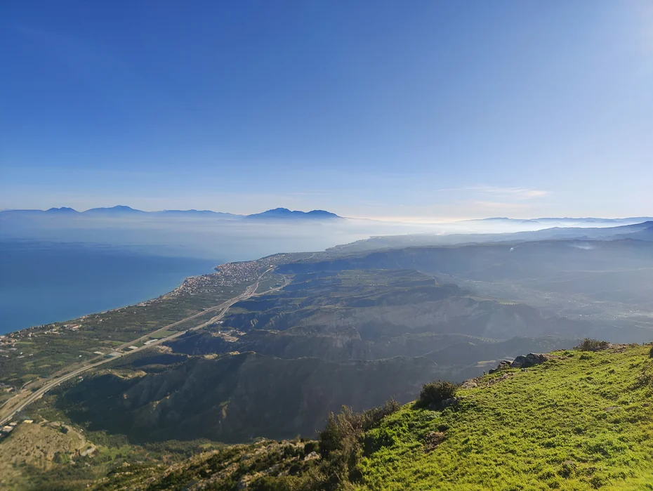Poměrně blízko od domova jsme si všimli vysoké hory vlevo od cesty s budovou nahoře. Tahle hora je trochu vyšší, než 700. Nejsou to žádná obrovská čísla, ale se tam vydáváme z hladiny moře. Nicméně tohle už bylo na procházku dost a tak jsme tam vyjeli. Nahoře je asi klášterMoni Panagias Korifis Je to taková soustava baráků, které uvidíte leda kde. Nicméně tím, že ta hora je vyšší než okolí, je odsud opravdu nádherný výhled (na fotce). Jsou tu i lavičky k posezení a! odpadkový koš!